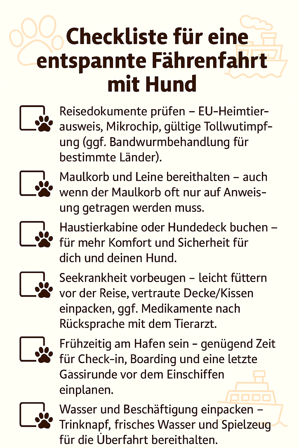 Auch auf Fähren gelten bestimmte Vorschriften, damit alle Passagiere – Menschen und Tiere – sicher und angenehm reisen können. Dein Hund braucht einen gültigen EU-Heimtierausweis, muss gechipt sein und eine aktuelle Tollwutimpfung haben. Auf manchen Strecken, besonders nach Großbritanien oder Irland, wird zusätzlich eine Bandwurmbehandlung verlangt.